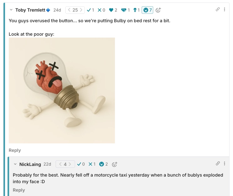 - Neutral votes (i.e. adding a reaction) no longer count toward the vote total. Previously, this was leading to people assuming they were downvoted more than in reality, like if you saw that a comment had 3 votes but only 1 karma. Oftentimes people will react (such as agree or disagree) without voting on the karma.