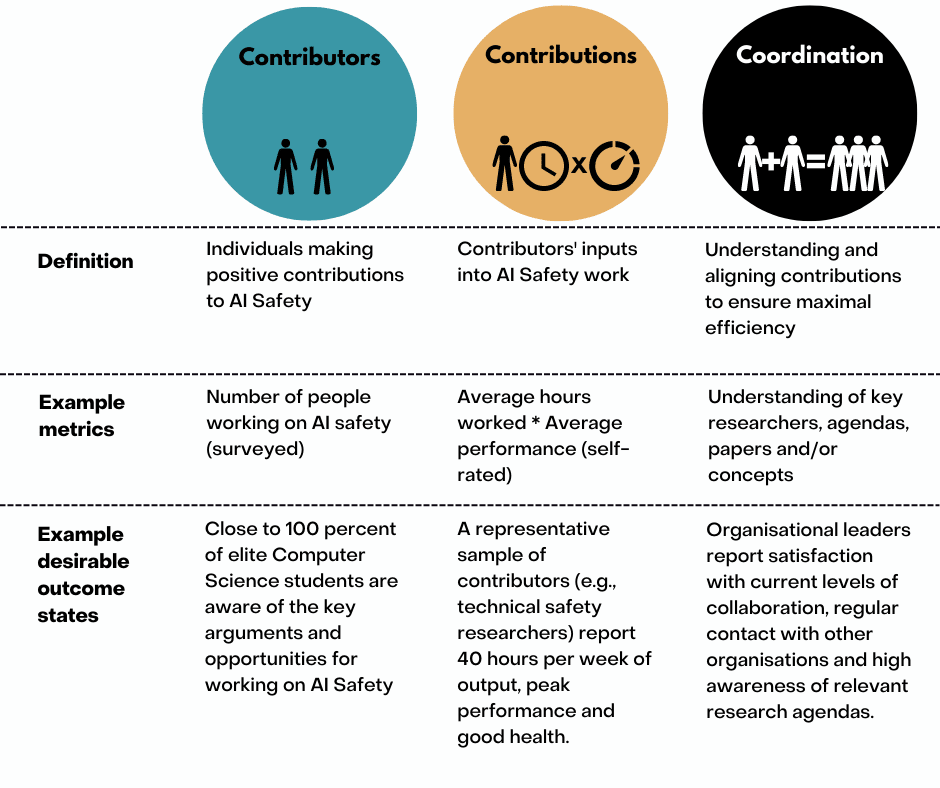 These outcome metrics are Contributors: how many people are involved in AIS Safety (total and as a percentage of what seems viable), Contributions: how well they are functioning and performing and Coordination: How well all contributors understand and work with each other.