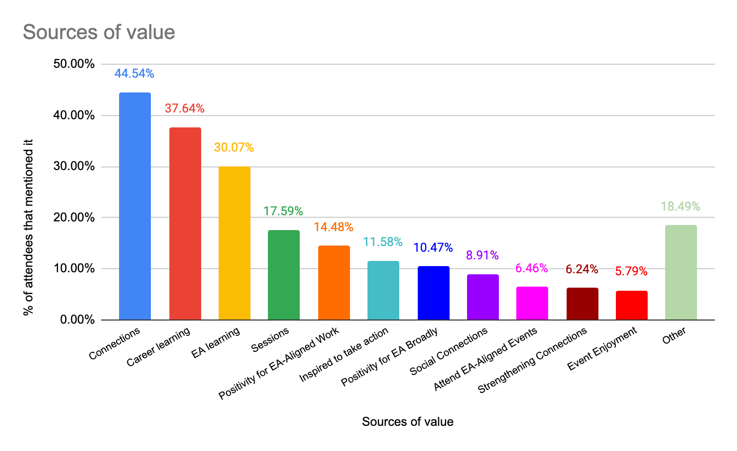 Earlier this year, I surveyed ~500 people who had attended an EAGx event or an event funded by the Community Events Programme. The key sources of value that attendees report getting are: