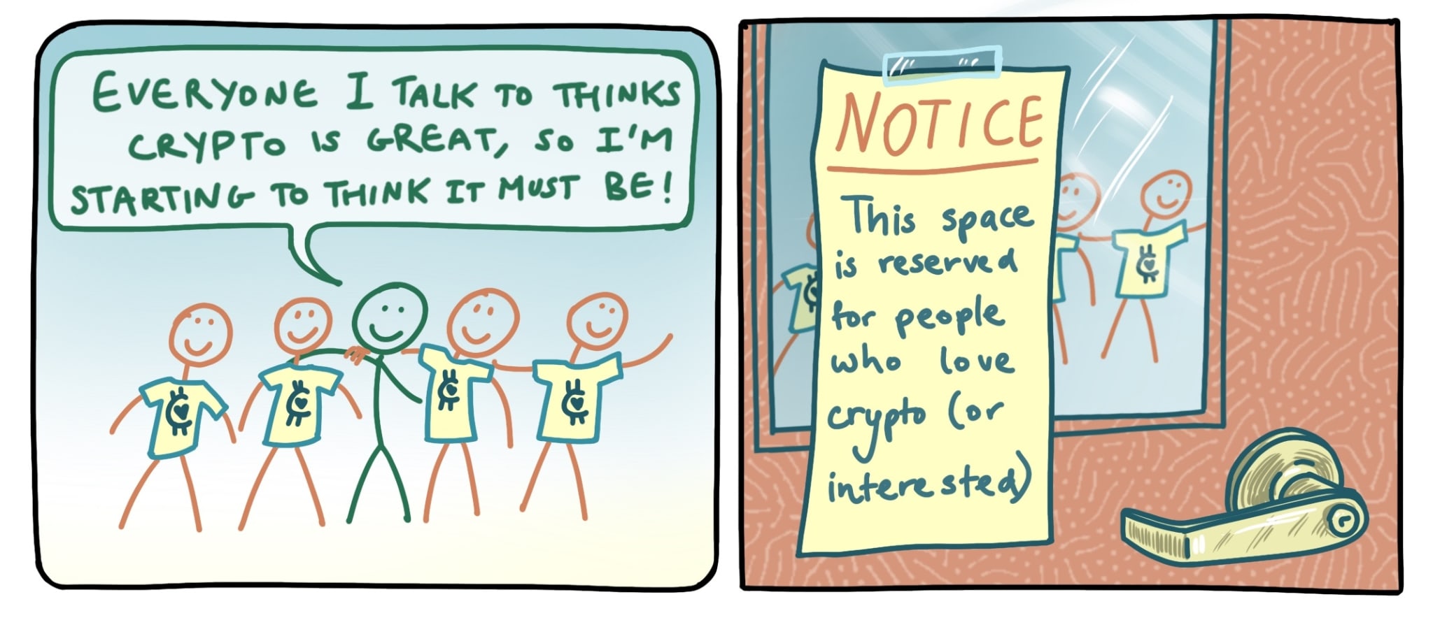 Note that the problem is not just an issue of who holds which beliefs but also who chooses to voice them. Suppose for the sake of the argument that 100 smart people initially have unbiased (but noisy) priors about whether cryptocurrency is valuable. If our beliefs about cryptocurrency were formed by an unweighted poll, we may hope to take advantage of crowd wisdom and get, if not true, then at least unbiased beliefs about cryptocurrency[1]. But instead, the only beliefs you’re likely to hear are from true believers (and a few curmudgeons with their own idiosyncratic biases), which sharply biases your views (unless you have a very careful search).