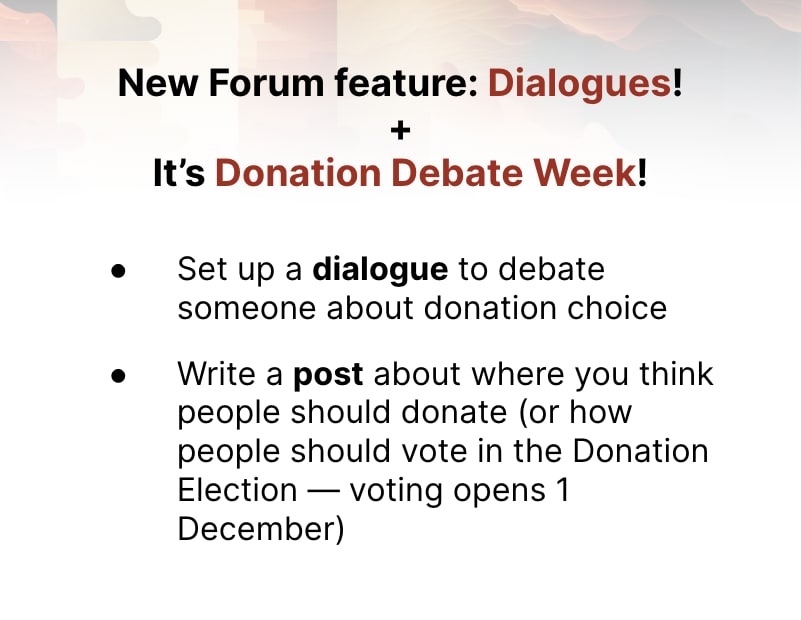 TL;DR: Donation Debate Week (21-28 November) has started! Just in time for it, we’ve added the Dialogue feature built by LessWrong[1], which allows you to create and publish a conversation with another user.