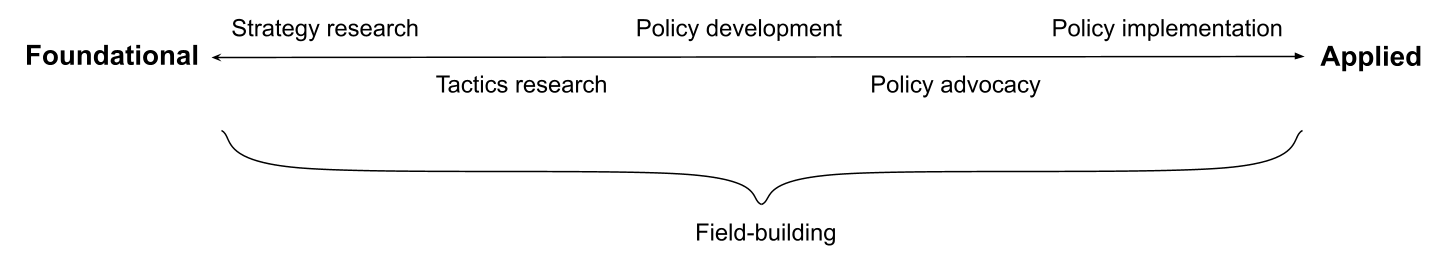 Parlando in astratto, penso sia utile visualizzare il lavoro di base e quello applicato come ai poli opposti di uno spettro. Dal lato del lavoro di base abbiamo la ricerca strategica, il cui scopo è individuare obiettivi astratti ideali per la governance lungoterminista delle IA; c'è poi la ricerca tattica, il cui obiettivo è individuare i programmi utili a raggiungere quegli obiettivi. Dal lato del lavoro applicato troviamo lo sviluppo di normative, il cui scopo è trasformare la ricerca in normative concrete; abbiamo poi lavoro che spinge perché quelle normative vengano applicate e infine l’applicazione vera e propria (ad esempio da parte di impiegati statali).