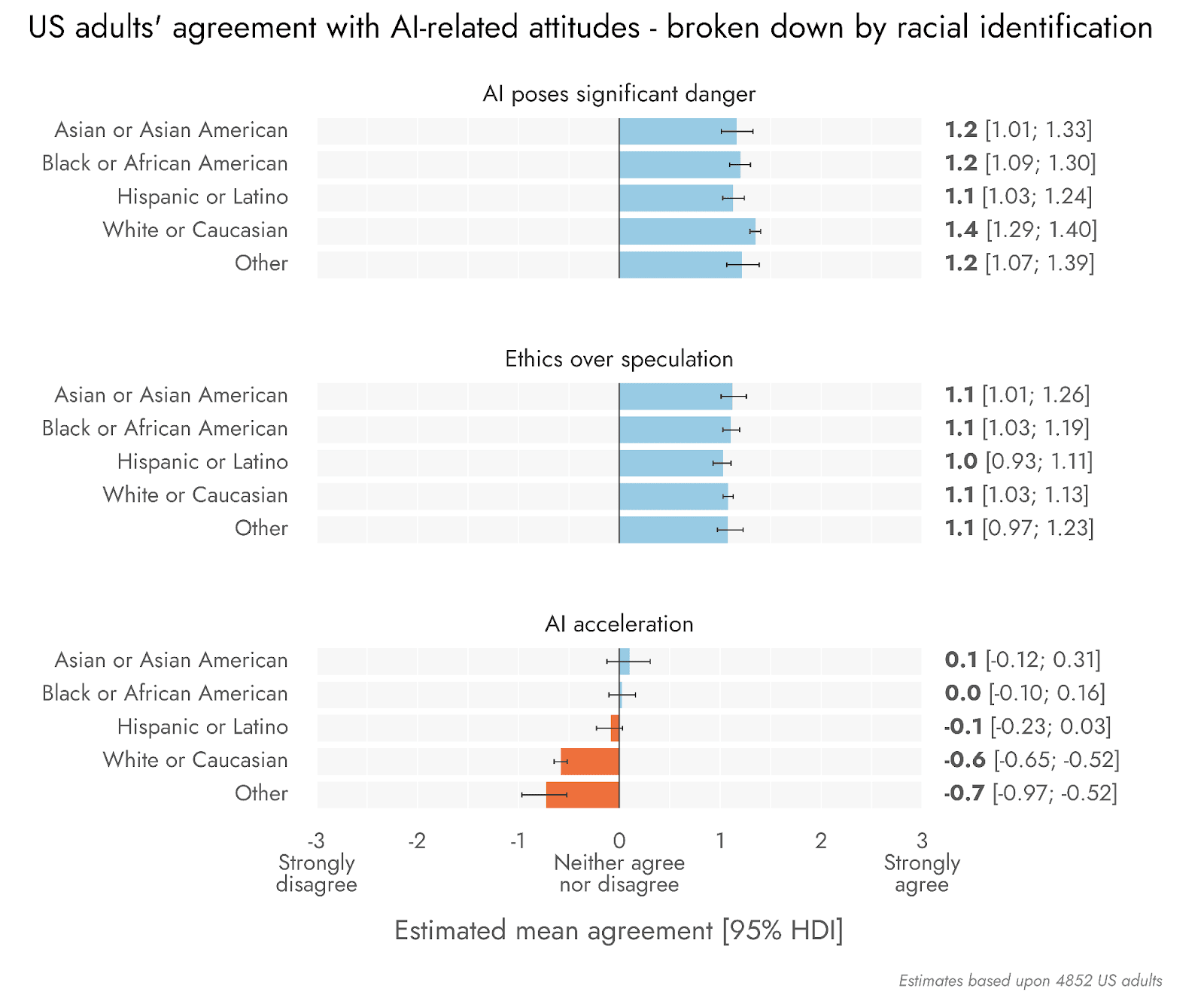 It might be suggested that communities plausibly at greater risk of facing such bias (for example, racial or ethnic minorities) would show greater endorsement of AI ethics. To the contrary, ratings of the importance of AI ethics were quite constant across different racial identities. However, the mean ratings and estimates of Probability of Superiority in each racial subgroup suggest that only White or Caucasian adults reliably rated AI risk more highly than AI ethics. Respondents of all racial identities were on average much more in agreement with each of these risk-oriented statements than with AI acceleration, although White or Caucasian respondents were more negative about AI acceleration than were Asian or Asian American, Black or African American, and Hispanic or Latino adults.
