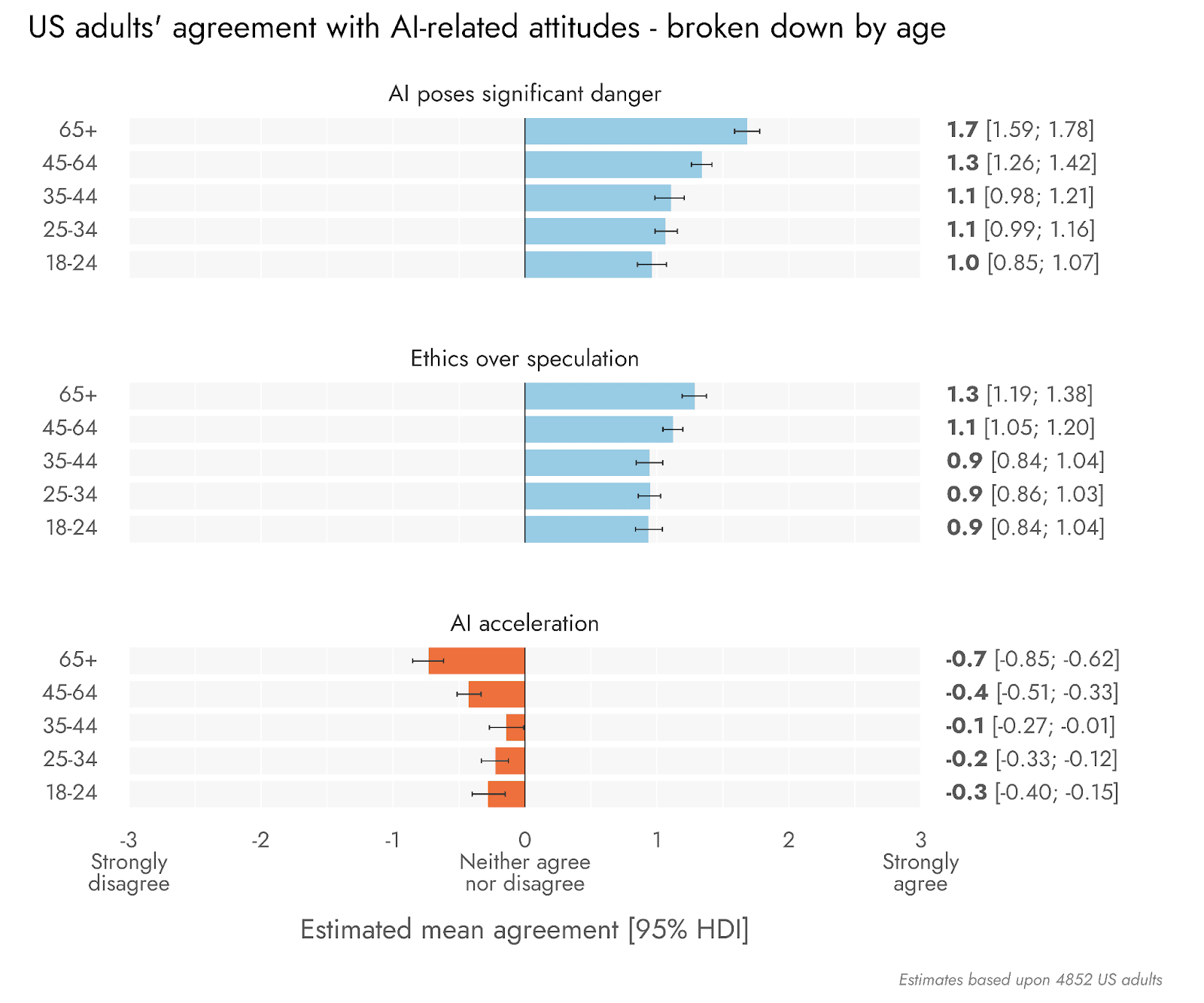 Some sizable age-related trends were also apparent. Across each age group, respondents tended to disagree more than agree with AI acceleration, and to agree with AI posing a significant danger and with Ethics over speculation. However, older adults were particularly negative about AI acceleration, and more positive about the risk-oriented statements.