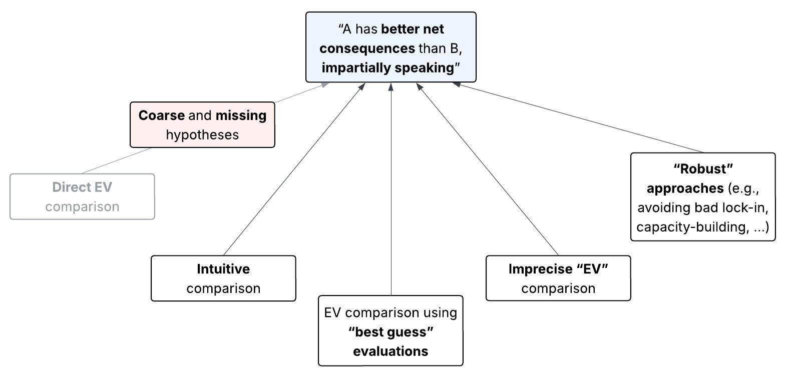 And then there’s us. We don’t merely share this agent’s limitations. Rather, we are also unaware (or at best only coarsely aware) of many possible outcomes that could dominate our net impact. How, then, can we weigh up these possibilities when making choices from an impartial perspective? We have some rough intuitions about the consequences we’re unaware of, sure. But if those intuitions are so weakly grounded that we can’t even say whether they’re “better than chance” on net, any choices that rely on them might be deeply arbitrary. So whether we explicitly try to maximize EV, or instead follow heuristics or the like, we face the same structural problem. For us, it’s not clear what “better expected consequences” even means.
