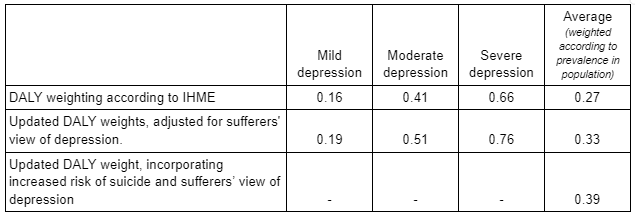 - We think that even with no change in philosophical assumptions, the DALY value of averting depression should be 20-45% higher than the IHME weighting suggests
