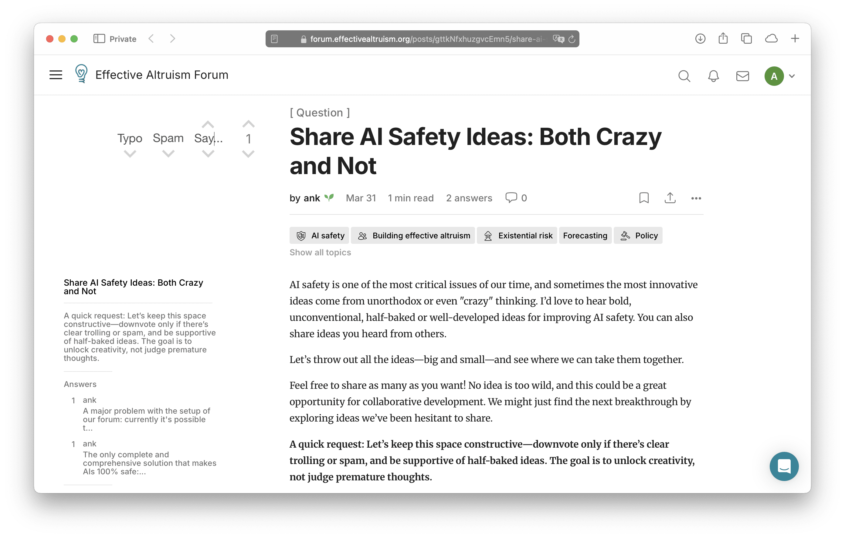 A major problem with the setup of our forum: currently it's possible to go here or to any post and double downvote all the new posts in mass (please, don't! Just believe me it's possible), so writers who were writing their AI safety proposal for months will have their posts ruined (almost no one reads posts with negative rating), will probably abandon our cause and go become evil masterminds.