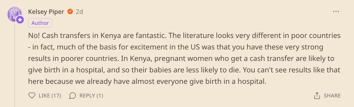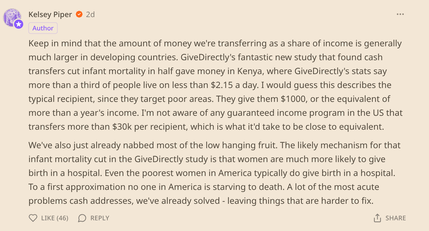 Kelsey Piper wrote a nice article on recent results of cash transfers in the US: Giving people money helped less than I thought it would