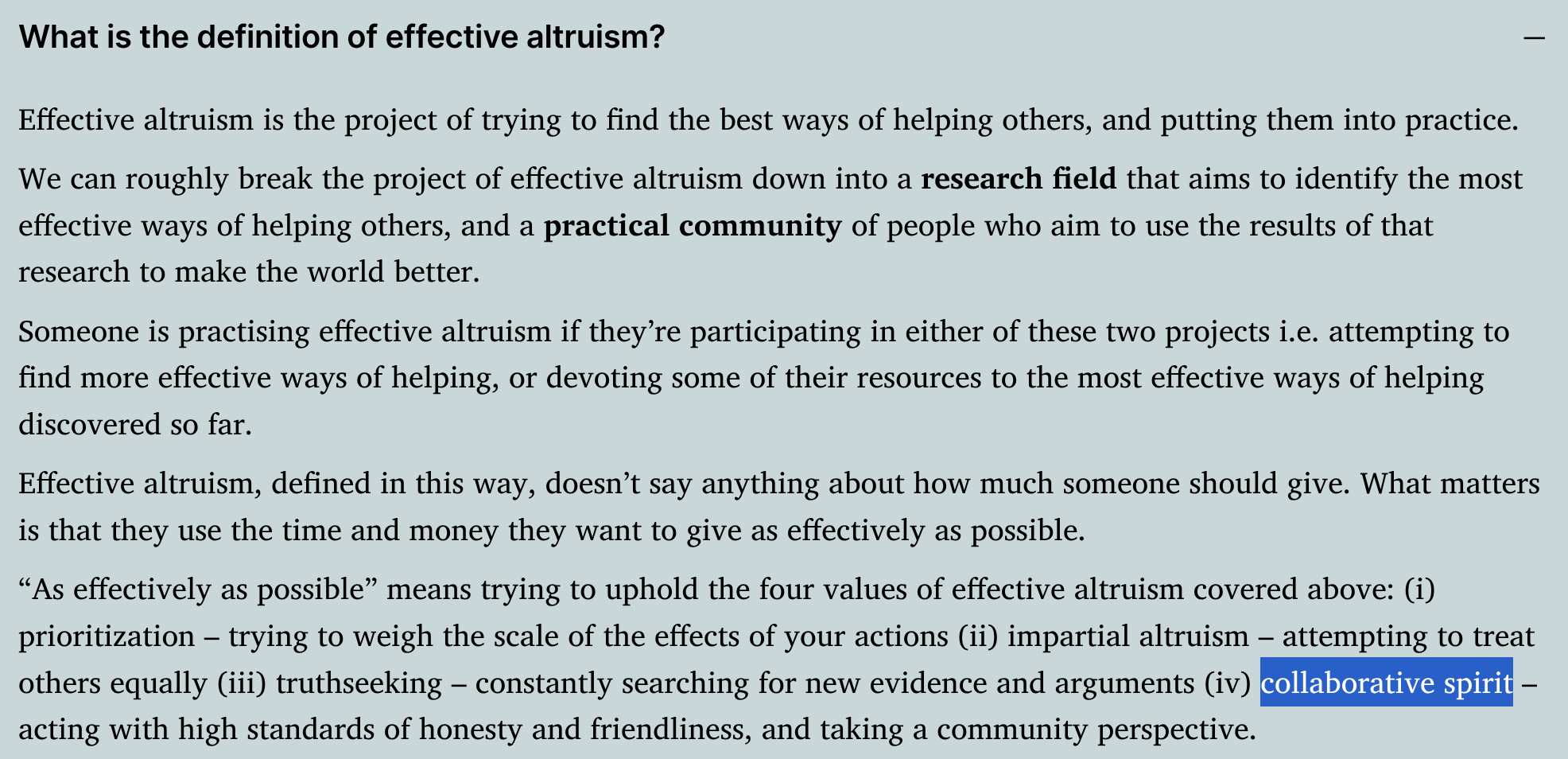 Not sure how useful this is, and you mentioned you can't speak for the choice of principles, but sharing on a personal note that the collaborative spirit value was one of the things I appreciated the most about EA when I first came across it.