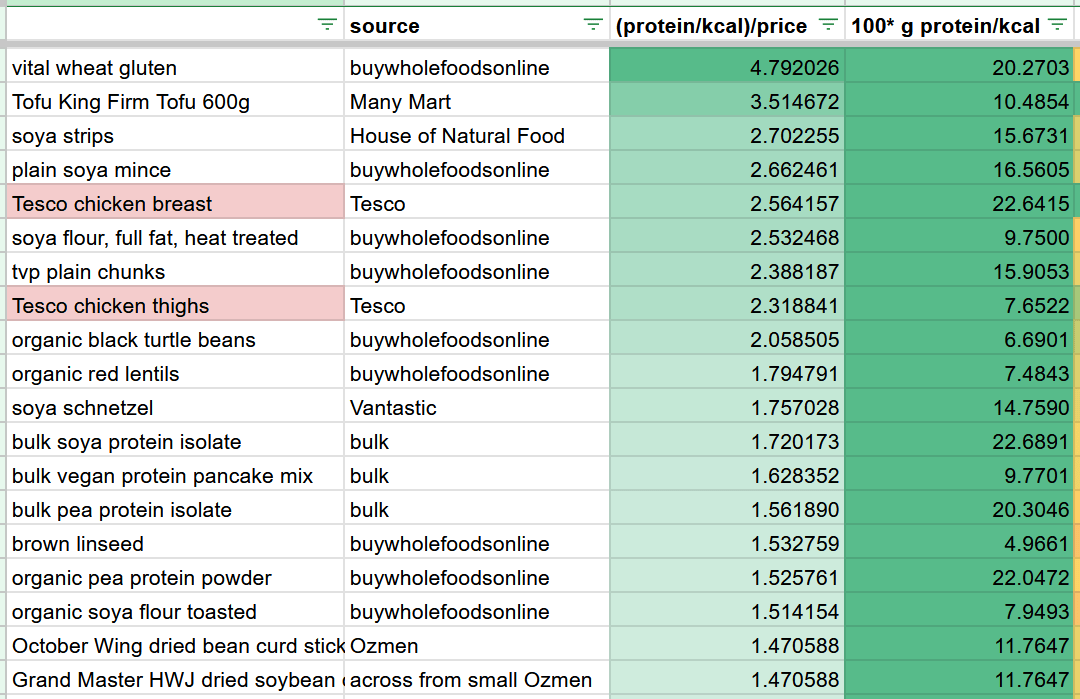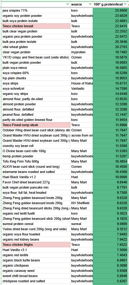 For (potential) vegans that are depressed at the sight of the protein/kcal table. Here's a screenshot of a similar table I put together last year (for myself - UK based). I like sharing this with gym bros that scoff at veganism for lean protein reasons.