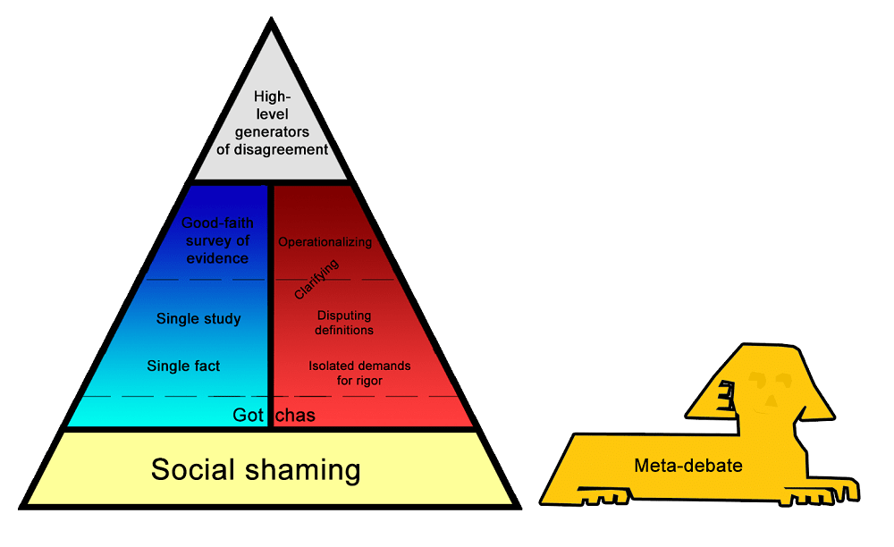 [Graham’s hierarchy of disagreements] is useful for its intended purpose, but it isn’t really a hierarchy of disagreements. It’s a hierarchy of types of response, within a disagreement. Sometimes things are refutations of other people’s points, but the points should never have been made at all, and refuting them doesn’t help. Sometimes it’s unclear how the argument even connects to the sorts of things that in principle could be proven or refuted.