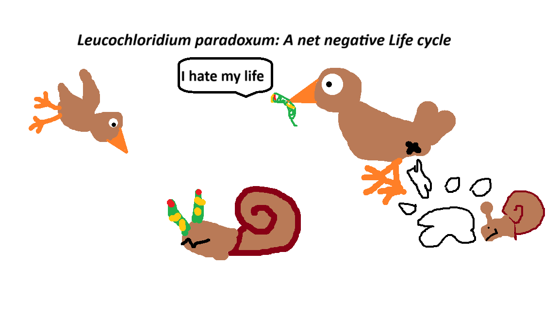 "Its intermediate hosts are land snails, usually of the genus Succinea. The pulsating, green broodsacs fill the eye stalks of the snail, thereby attracting predation by birds, the primary host. These broodsacs visually imitate caterpillars, a prey of birds. The adult parasite lives in the bird's cloaca, releasing its eggs into the faeces."