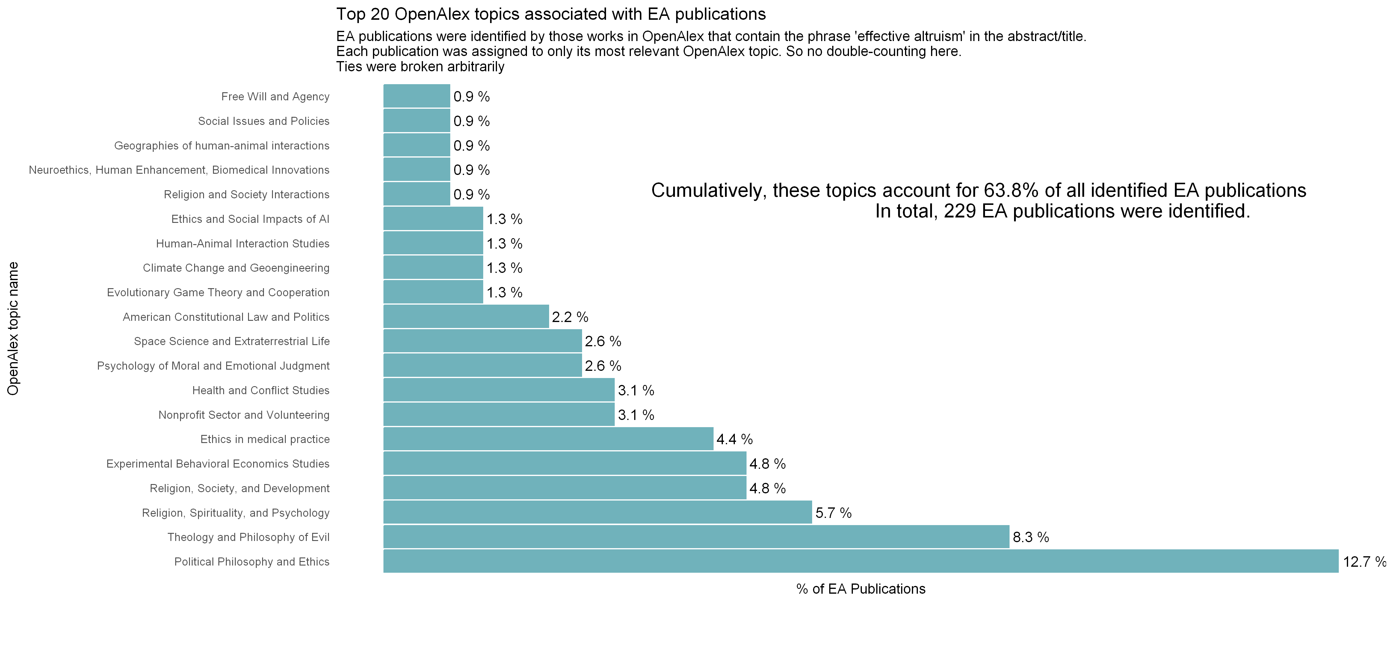 Great comment David! It made me focus in on the heart of the question here. It is simply this - What is the right counterfactual to EA, the philosophy/academic discipline? OP is comparing EA philosophy/discipline to Econ. But is that fair? When I read your comment this morning, I noticed how I utterly failed to clarify that EA is less rigorous... than what?! It got me thinking empirically and I quickly whipped up some stuff using OpenAlex which is a open-source repository of publications used by bibliometricians. Now this preliminary analysis I show doesn't resolve the question of what is counterfactual to EA, but it begins to describe the problem better.