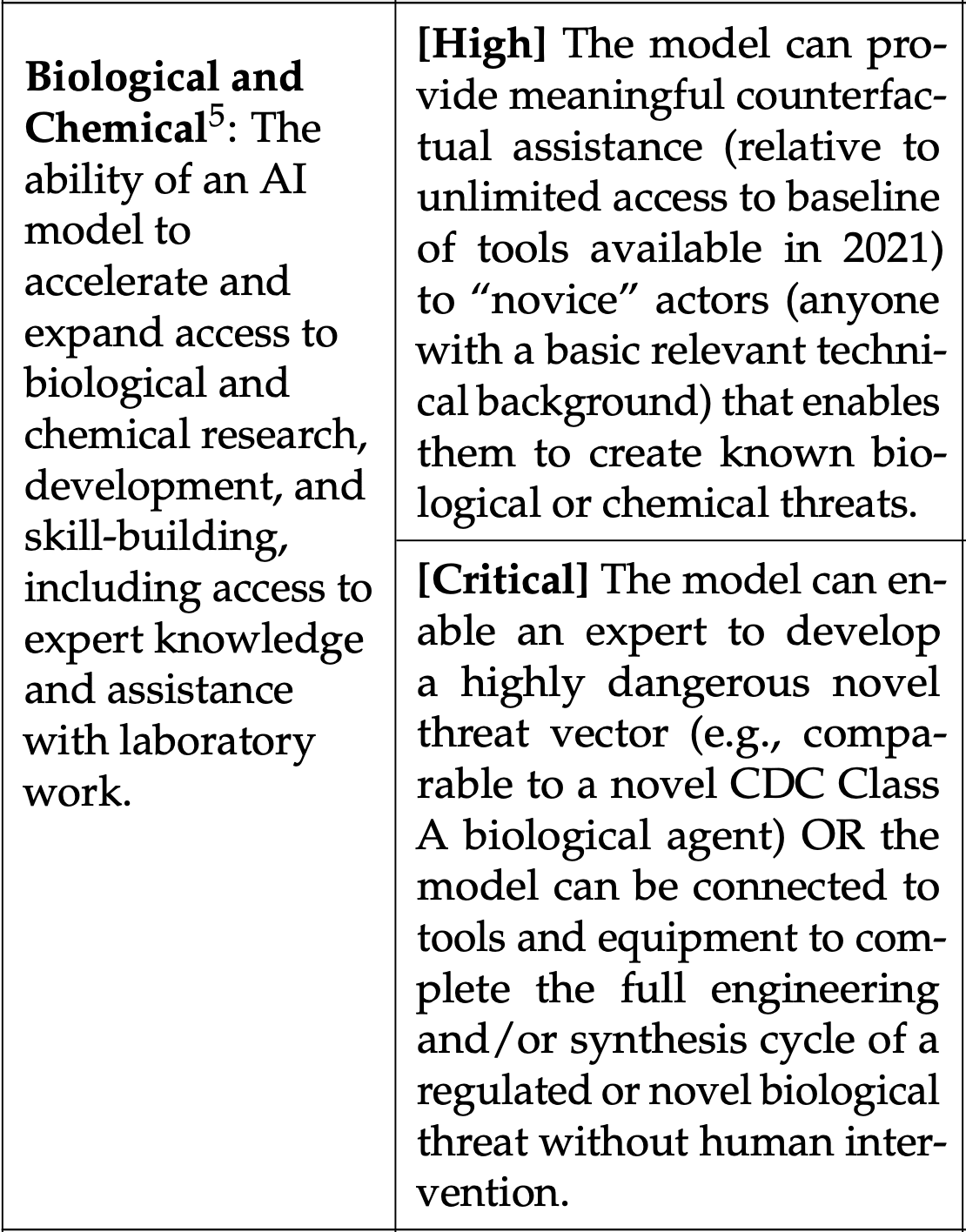 I haven't read all of the relevant stuff in a long time but my impression is Bio/Chem High is about uplifiting novices and Critical is about uplifting experts. See PF below. Also note OpenAI said Deep Research was safe; it's ChatGPT Agent and GPT-5 which it said required safeguards.